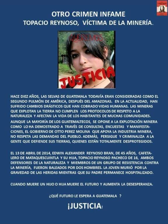 Late on Sunday, 13th April 2014, around 10:30pm, father and daughter activists involved in the resistance against Tahoe Resources’ Escobal Mine, Edwin Alex Reynoso and Merilyn Topacio Reynoso (above), were attacked by unknown suspects. Alex and Topacio were on their way home from Matequescuintla after attending an activity there. Topacio was shot and killed; Alex was severely wounded and remains in intensive care. While details of the attack against Alex and Topacio remain unclear, the incident forms part of a larger pattern of recent violent acts and intimidation against those who defend their right to life and territory.
