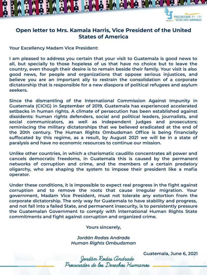 Jordán Rodas Andrade, the Guatemala Human Rights’ Ombudsman wrote the following to Kamala Harris, the U.S. Vice-President on her visit to Guatemala.