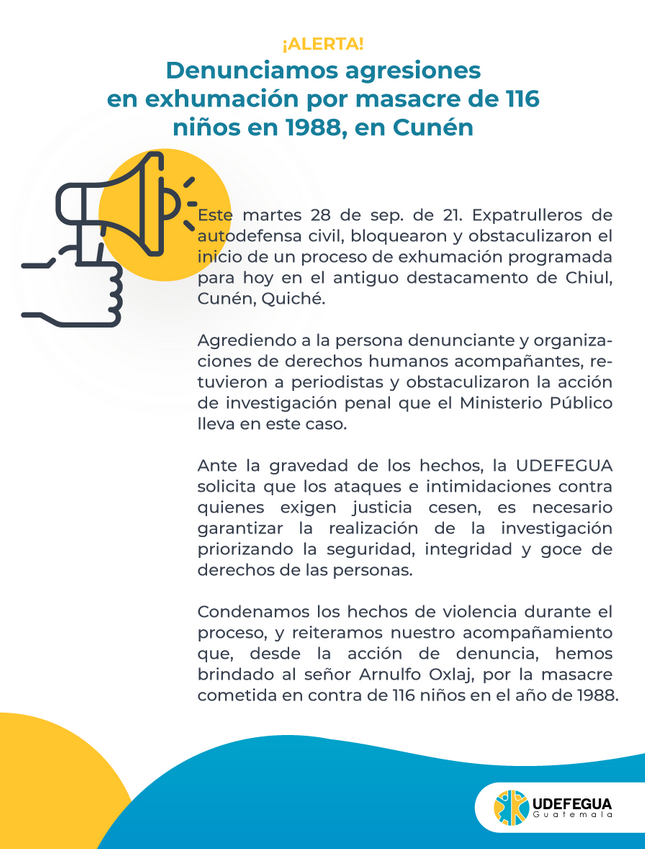 The above alert was issued by UDEFEGUA in response to an attack on members of the Public Prosecutor’s office in carrying out an exhumation on the site of a former military base in Quiché. Also attacked were Arnulfo Oxlaj, a survivor of the massacre, human rights accompaniers, and journalists. The exhumation is to be carried out in coordination with FAFG.