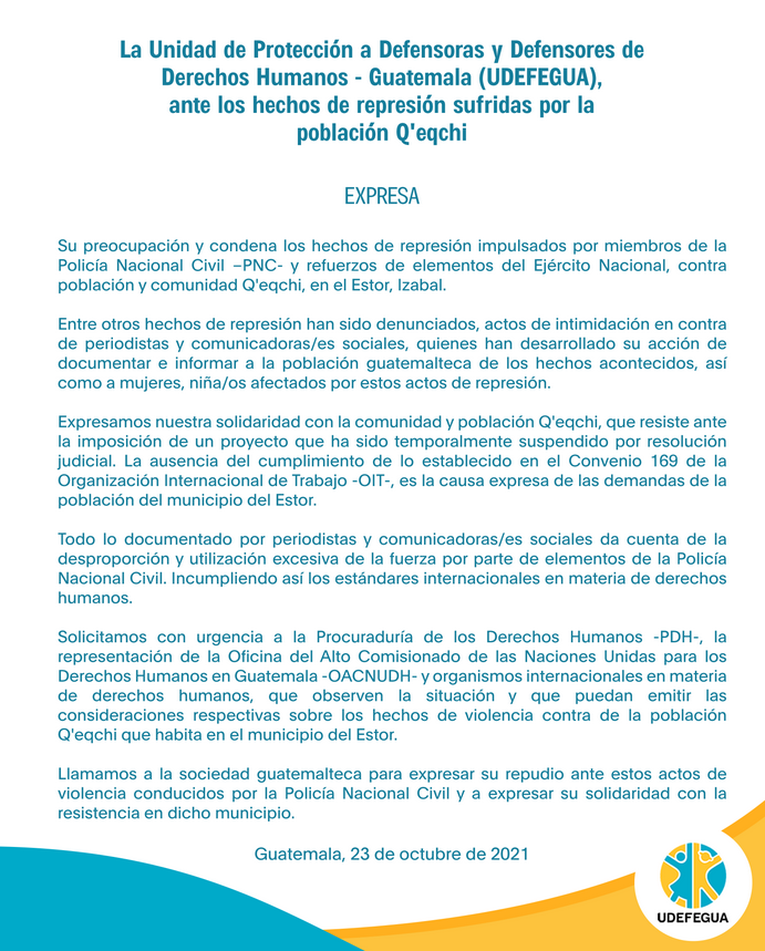 Its concern and condemnation of the acts of repression carried out by members of the National Civil Police (PNC), and reinforcements of elements of the Army, against the Q’eqchi population and community in El Estor, Izabal.