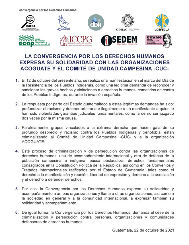 5. Therefore, the Convergence for Human Rights Coalition expresses its solidarity and support to both organisations, and calls on other organisations, as well as society in general and the international community, to also express their solidarity and accompaniment.
