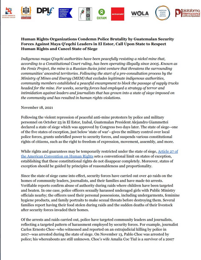 Ten human rights organisations recently released a joint statement condemning police brutality in El Estor.