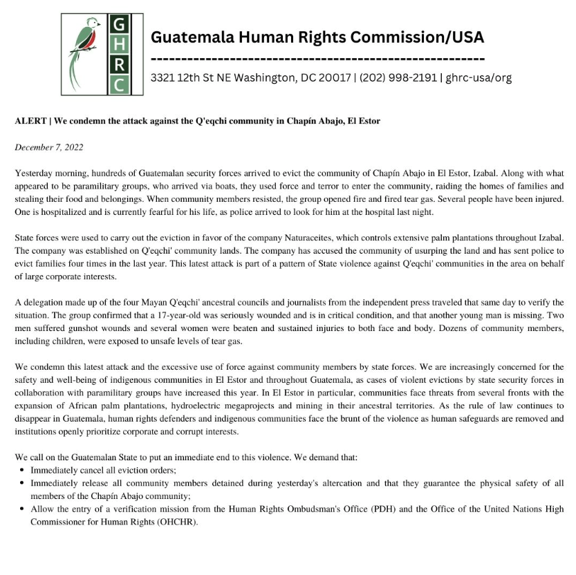 GHRC recently issued an alert condemning the violence perpetrated by State security forces against the Indigenous Q’eqchi community in Chapin Abajo, El Estor. Read the full statement above.
