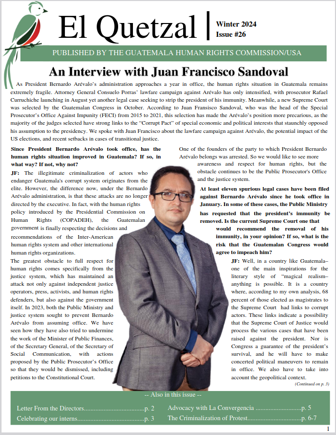 The Winter 2024 edition of El Quetzal, from The Guatemala Human Rights Commission (GHRC), has recently been published. It features an interview with Juan Francisco Sandoval, who was the head of the Special Prosecutor’s Office Against Impunity (FECI) from 2015 to 2021. As President Bernardo Arévalo’s administration approaches a year in office, the human rights situation in Guatemala remains extremely fragile. Attorney General Consuelo Porras’ lawfare campaign against Arévalo has only intensified, with prosecutor Rafael Curruchiche launching yet another legal case seeking to strip the president of his immunity.